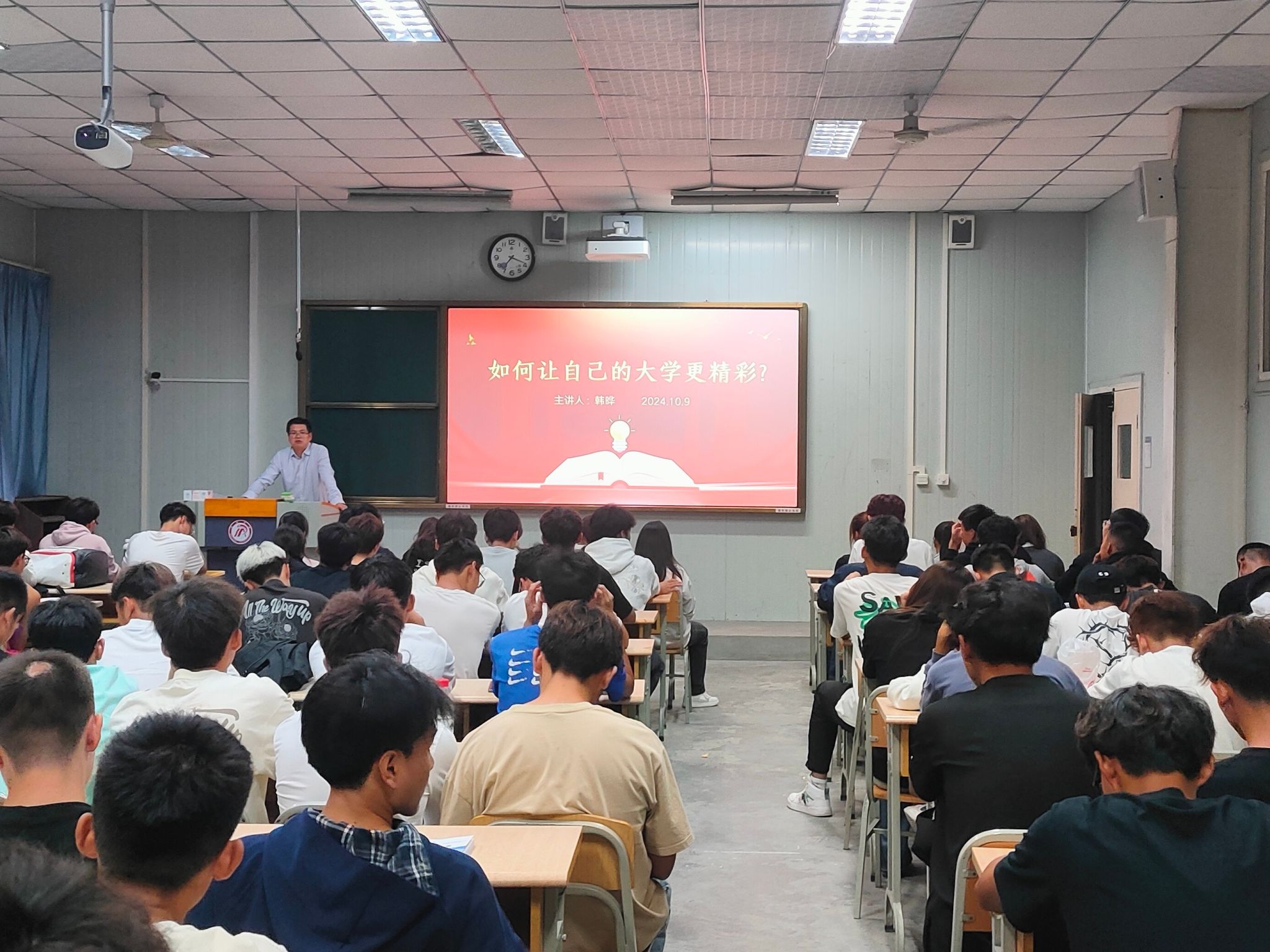2024年10月9日晚上,WILLIAMHILL在线体育投注党总支书记韩晔在10号教学楼1038教室为2024级体院新生带来入学教育课——如何让自己的大学更精彩。韩书记从“认识大学、学会学习、遵守纪律、做好发展”四个方面勾勒出精彩大学四年应有画像雏形,为24级全体新生带来大学启蒙教育,帮助他们正确认识大学,认识自我,了解未来发展趋势,坚定专业自信。