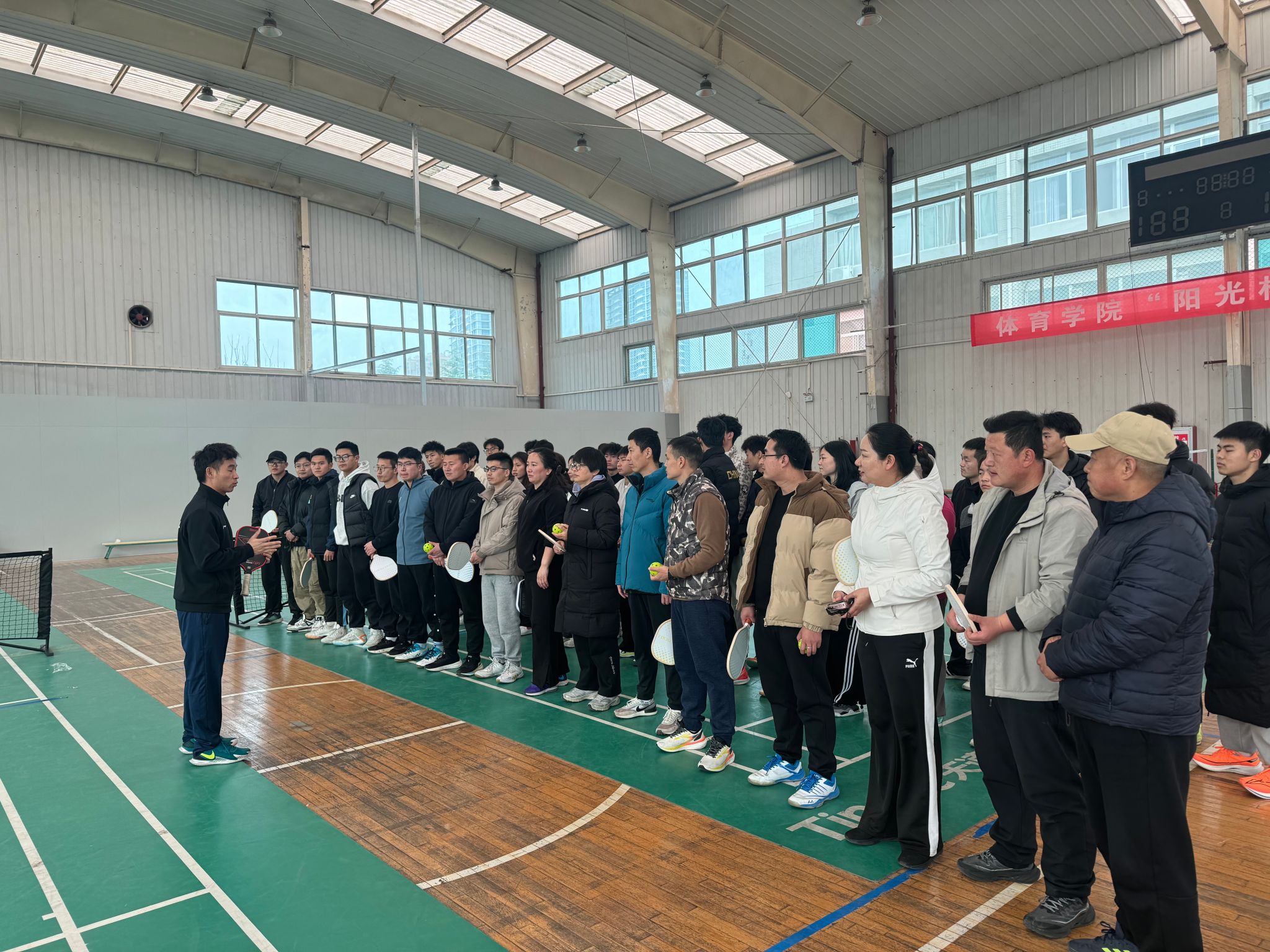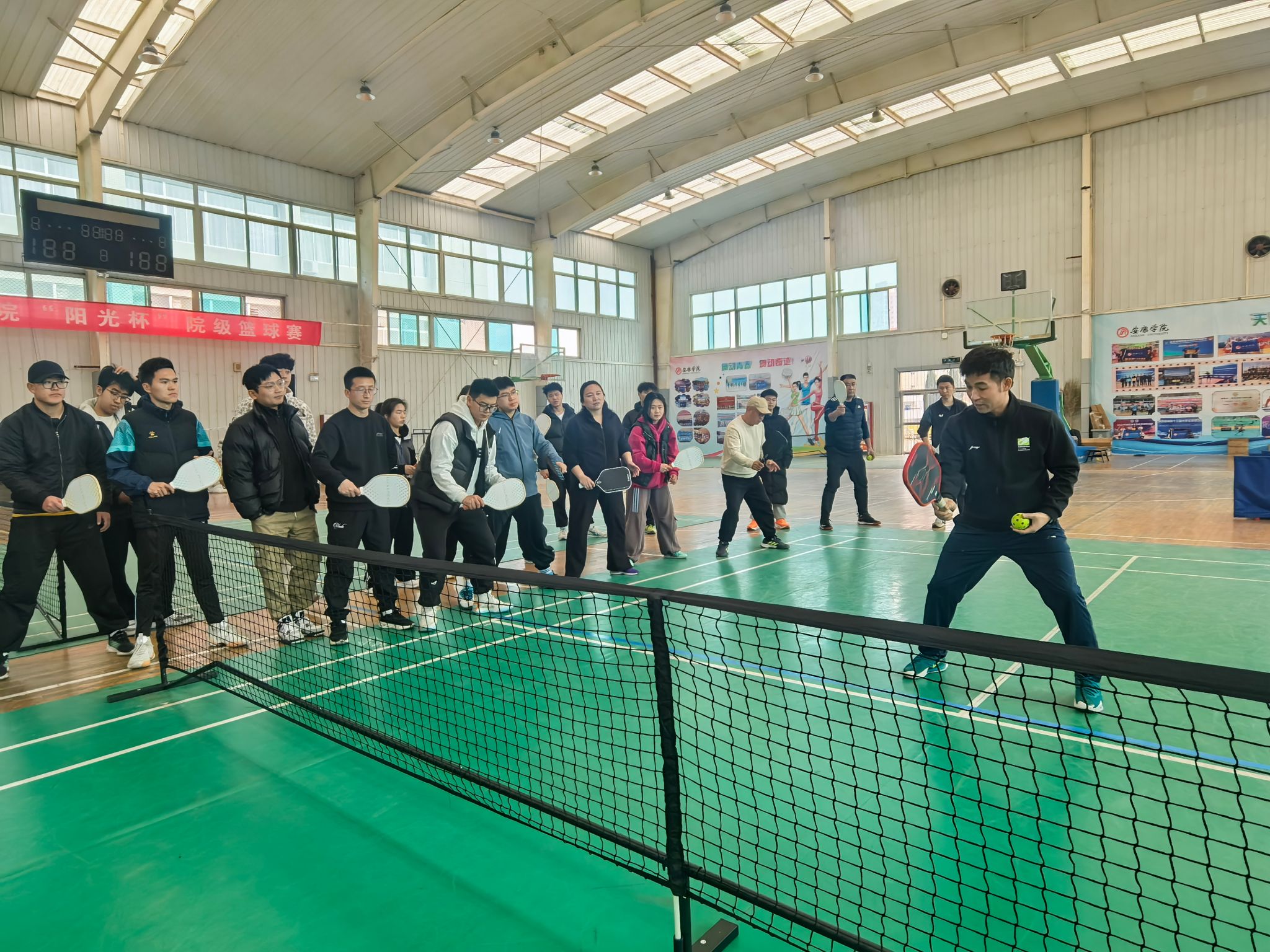 在理论讲座环节,曹峰教授从匹克球的起源、技术、规则解析、战术策略等,进行了系统而深入的讲解。随后的实践环节,他结合自身多年的教学经验,深入浅出地剖析了匹克球的技术要点,并在现场亲自示范标准动作,耐心纠正学员们的错误姿势。在曹峰教授的指导下,大家从基础挥拍到战术配合,逐步掌握了匹克球的实战技巧。现场气氛热烈,学员们热情高涨。